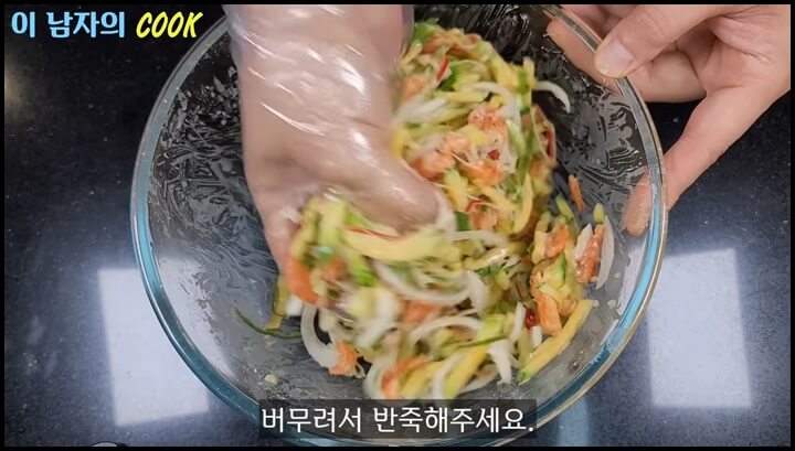 3) 이대로 10분 정도 절여줍니다. 애호박과 양파에서 수분이 빠져나오도록 합니다.