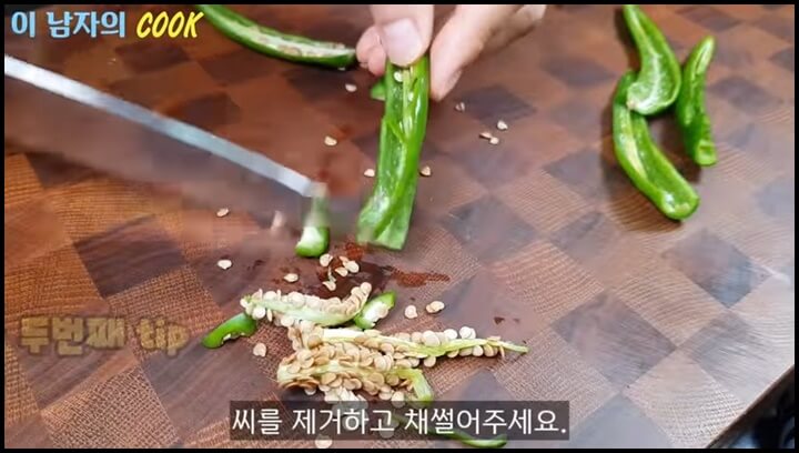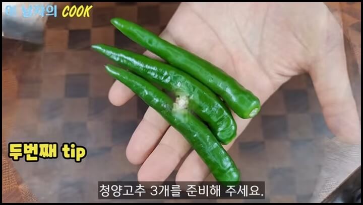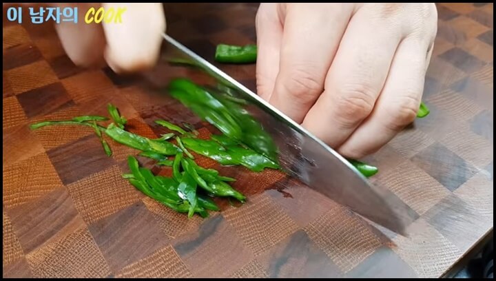 2) 기름의 느끼함을 잡아주고 매콤함을 더해서 입맛을 올려줄 청양고추 3개를 준비합니다. 반으로 갈라 씨를 제거한 후 애호박 모양과 비슷하게 가늘게 채 썰어줍니다.