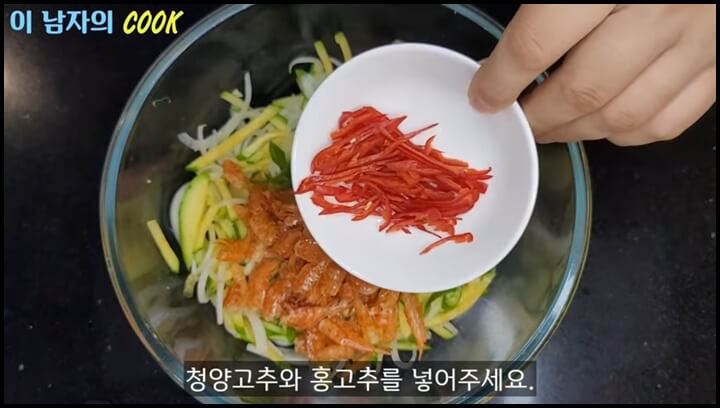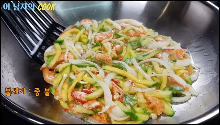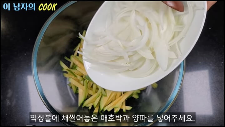 1) 애호박 채 썬 것과 양파 채 썬 것을 그릇에 모두 담아줍니다.