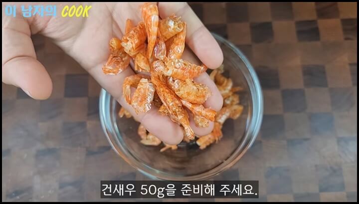 1) 건새우 50g을 준비합니다. 새우는 꽃새우, 밥새우, 두절 새우 등 감칠맛을 내는 새우라면 어떤 것이든 상관없습니다.