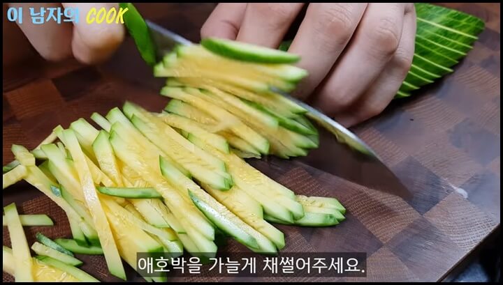 애호박 1개를 준비해 얇게 썬 다음 가지런히 놓고 가늘게 채 썰어줍니다.