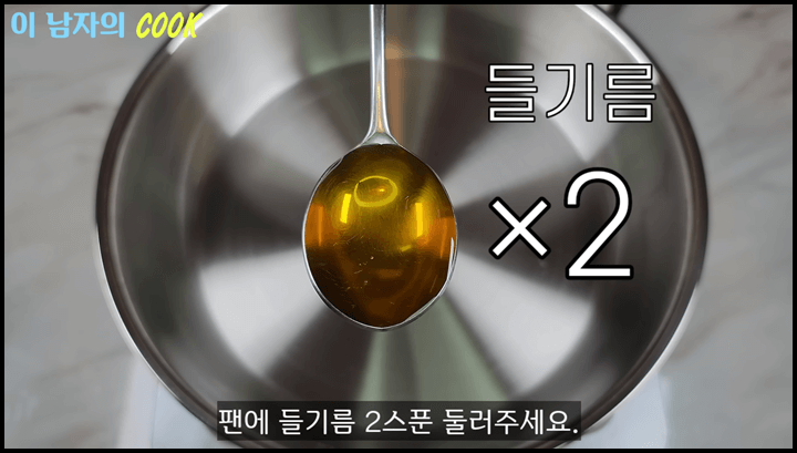 1) 팬에 들기름 2스푼과 식용유 1스푼을 넣어줍니다.