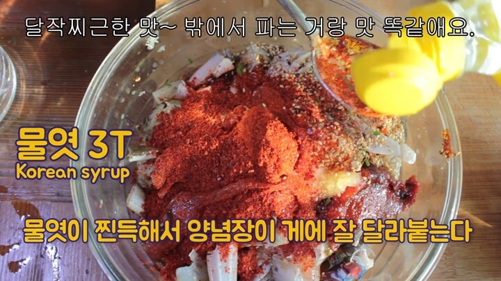 고춧가루 5~6큰술, 물엿 3큰술을 넣어줍니다. 물엿은 찐득하기 때문에 양념장에 게에 잘 달라 붙게 합니다. 윤기도 나고 말입니다.