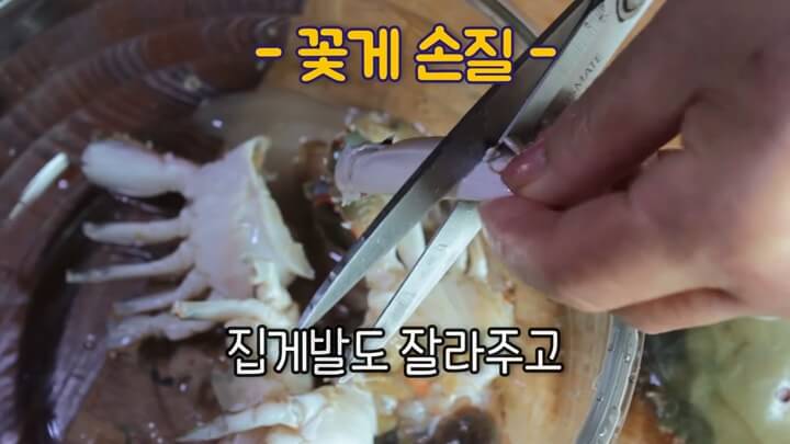 집게 다리도 잘라주어야 게의 맛있는 맛이 빠져나옵니다. 집게도 잘라줍니다.