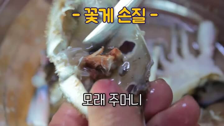 활꽃게를 씻을 때는 대야에 물을 조금 넣고 착착 까불러줍니다. 솔로 껍질을 잘 문질러 씻은 다음, 배딱지를 젖혀서 떼 주고, 게딱지를 열어줍니다.