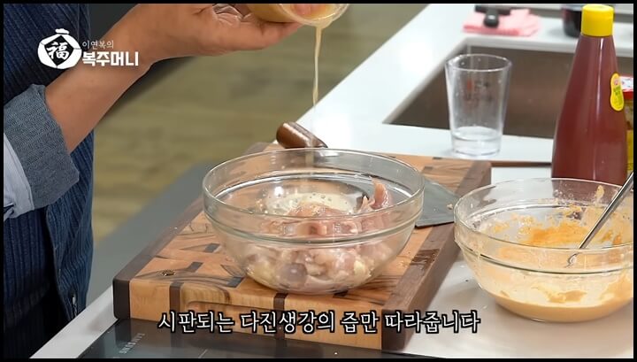 4) 닭다리살에 생강즙을 넣어줍니다. 다진 생강을 사면 생강즙이 많이 나오는데 즙만 쭈욱 짜서 넣어주면 됩니다. 생강이 닭의 잡내를 잡아줍니다.