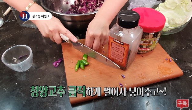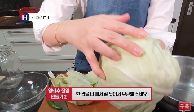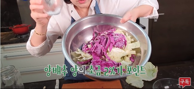 신선하지 않은 양배추를 사용할 경우 물이 잘 안나와서 이렇게 절였을 경우 양배추 물이 올라오는 것이 아닌 양배추가 위로 쑥 떠오르기도 하는데요, 이럴 경우에는 소금물을 만들어서 넣어주면 된다고 해요. 양배추가 충분히 잠길정도의 소금물을 만들어 넣어주면 돼요.