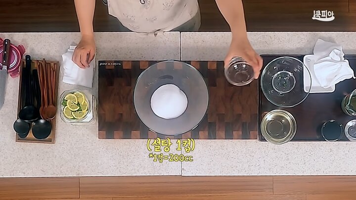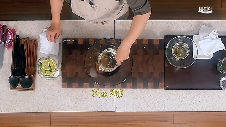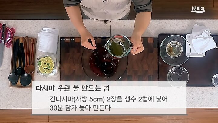 간장과 식초, 설탕을 잘 녹게 하면서 맛을 잘 나게 하는 것이 있으니 그것은 바로 다시마 우린 물이에요. 다시마 우린 물은 건다시마 사방 5cm 크기 2장을 생수 2컵에 넣어 30분간 담가 두어 만들어요.