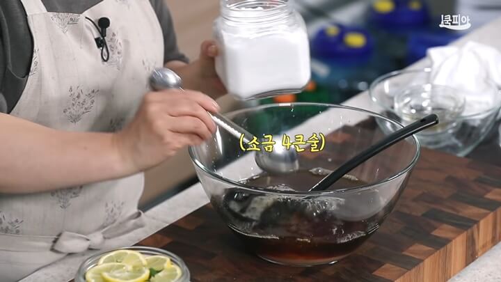 여기에 마지막으로 소금 4큰술을 넣어줍니다. 설탕과 소금이 녹을 때까지 잘 저어줍니다.