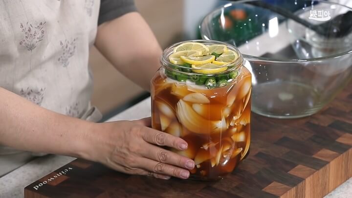 설탕과 소금이 다 녹았으면 양파를 담은 유리병에 간장물을 부어줍니다. 레몬 위로 장물을 부어주면 레몬을 지나 청양고추를 지나 양파로 가기 때문에 레몬맛과 매콤한 맛이 배어서 내려가고 또 특히 골마지가 끼지 않는다고 해요.