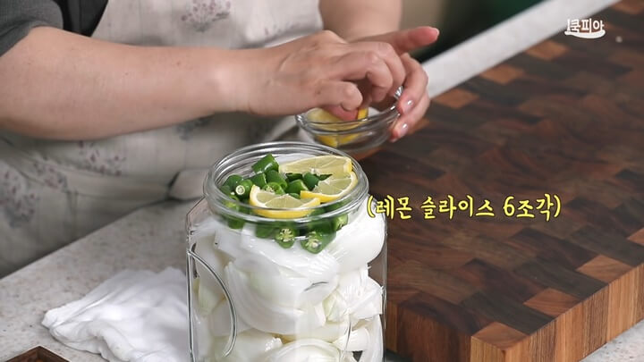 레몬을 넣어주면 양파의 식감이 훨씬 더 좋아질 뿐 아니라 양파장아찌의 맛도 더 싱그러워져요.