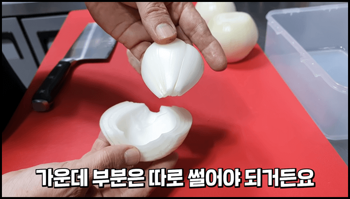 1) 양파를 반으로 가른 후 속에 든 작은 부분은 따로 빼서 썰어줍니다.