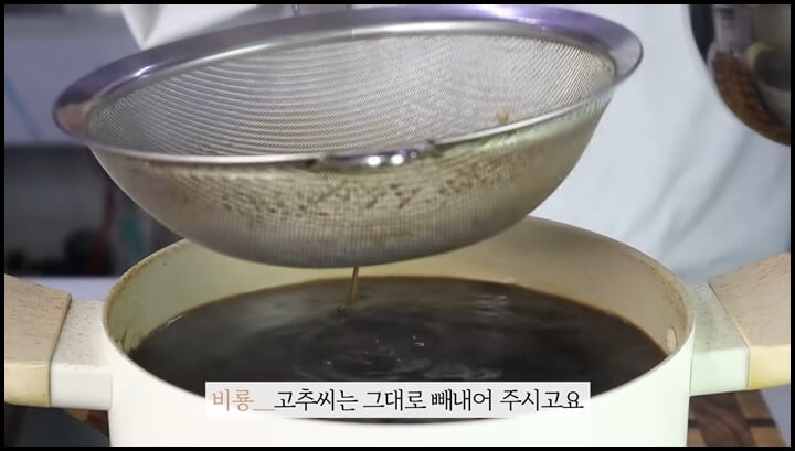 5) 체를 받치고 고추씨 두 큰술을 넣어 줍니다. 약불에 고추 씨를 넣어서 5분간 끓여줍니다.