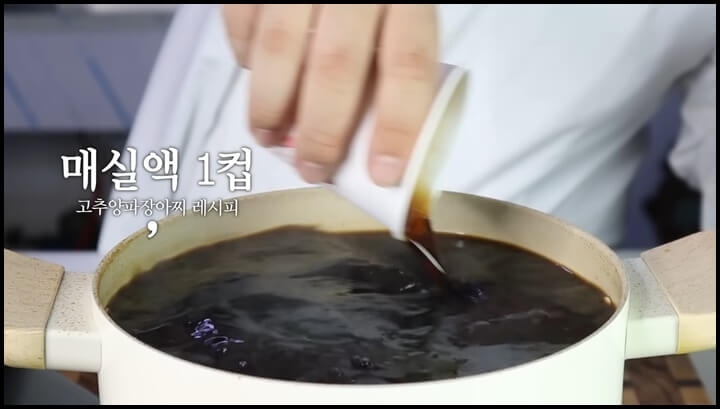 매실액은 진간장의 부족한 감칠맛을 확 살려 주기 위해서 마지막에 넣어 주는 것입니다. 그래서 불을 끄고 마지막에 식초, 설탕, 매실액을 넣어서 녹여주면 됩니다.