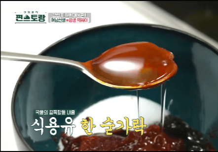 여기서 끝이 아닙니다. 떡볶이의 바디감, 묵직한 맛을 위해서는 지방이 필요한데요, 가정에서는 식용유를 사용하시면 됩니다. 식용유 1큰술을 추가로 넣어줍니다.