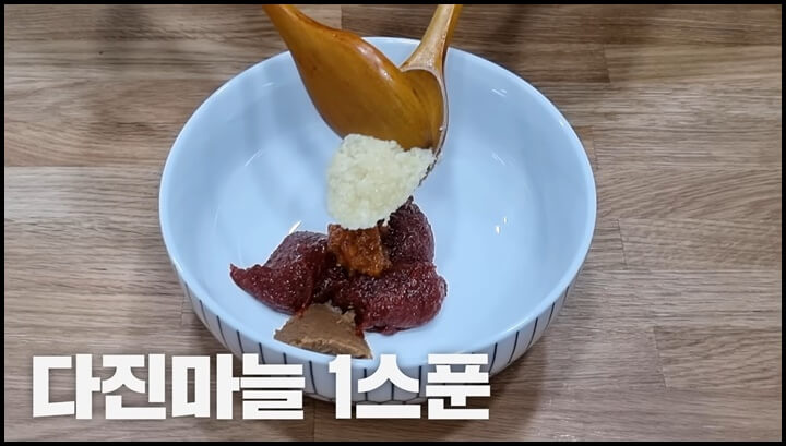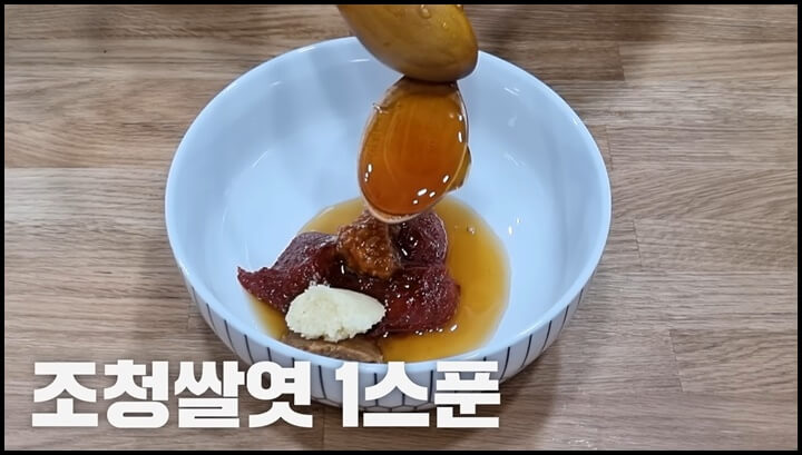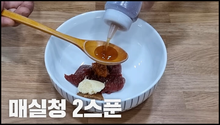 2) 다진마늘 1스푼, 매실청 2스푼, 조청 쌀 1스푼, 참기름 1스푼, 식초 1스푼을 넣어줍니다. 식초는 취향껏 넣어주면 되는데, 호불호가 있긴 하지만 김대석 셰프님은 식초 넣는 것이 더 맛있다고 합니다.