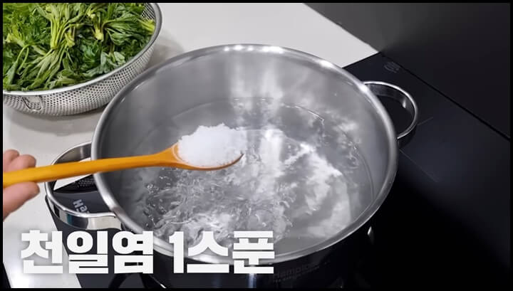 물이 끓고 있을 때 천일염 한 스푼을 넣어서 녹입니다. 그리고 손질한 엄나무순을 넣어서 데치는데, 데치는 시간은 1분 30초가 가장 적당합니다. 너무 오래 데치면 아삭함이 없어지니 데치는 시간을 잘 지켜줍니다.