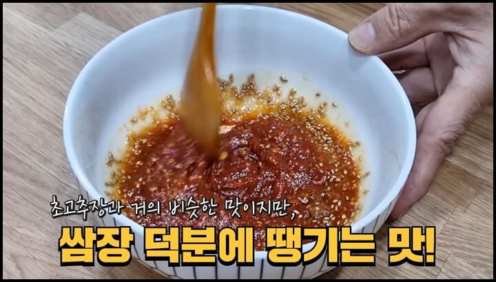 초고추장과 거의 비슷한 맛이지만, 쌈장 덕분에 당기는 맛이 나는 양념장입니다. 엄나무순 무침 양념장을 이렇게 만들면 맛이 없을 수가 없습니다!