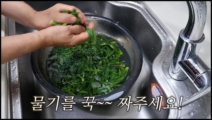 숨이 죽으면 위아래로 한번 뒤집어 줍니다. 엄나무순이나 두릅 등은 쓴 맛이 굉장히 강하기 때문에 꼭 데쳐서 요리하는 것이 좋습니다.