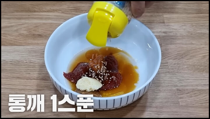 3) 통깨 1스푼를 넣고 골고루 잘 섞어줍니다.
