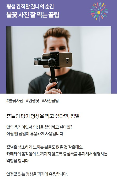 여의도 불꽃 축제의 화려한 불꽃쇼를 눈으로만 보기엔 너무 아쉽죠. 추억을 저장하고 아름다운 불꽃을 저장하기 위해서는 카메라가 필수입니다. 카메라, 스마트폰을 준비하고 사진 찍는 꿀팁에서 알려드린 것처럼 삼각대나 셀카봉을 준비하면 더욱 멋진 사진을 촬영할 수 있습니다.
