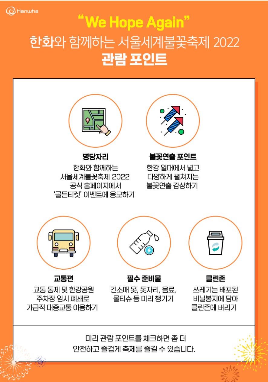 이상 2022년 여의도 불꽃축제, 서울 세계불꽃축제 명당Top3 및 준비물 등 꿀 정보를 알아보았습니다. 화려한 불꽃축제를 통해 코로나로 힘들었던 모두에게 새로운 에너지와 추억을 만들어주는 시간이 되었으면 좋겠습니다. 예쁜 추억 많이 만드세요. 감사합니다.