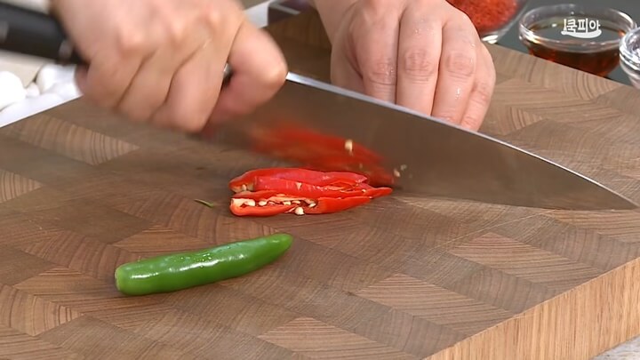 열무김치 맛있게 담그는법황금레시피 양념장의 핵심 재료는 바로 물고추인데요, 물고추를 넣어주면 열무김치가 훨씬 더 싱그럽고 맛있게 만들어져요. 물고추 10개는 믹서기에 갈아줄 거니 적당하게 잘게 썰어주세요.