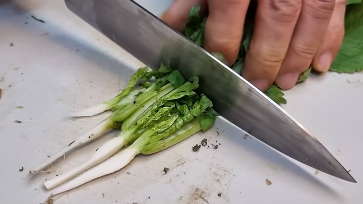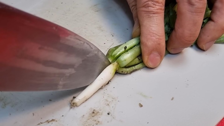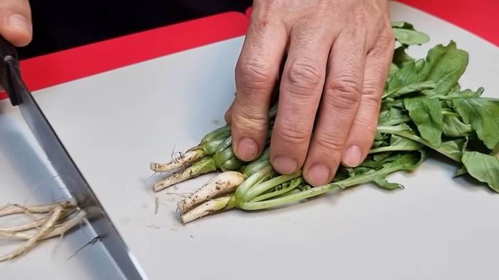 열무를 다듬을 때는 먼저 열무 뿌리 끝쪽을 칼로 잘라주고, 뿌리를 긁어서 껍질을 제거해 줍니다. 그런 다음 열무 뿌리를 를 반으로 가르고, 굵은 것은 한 번 더 반으로 갈라 2등분~4등분으로 나눠줍니다.