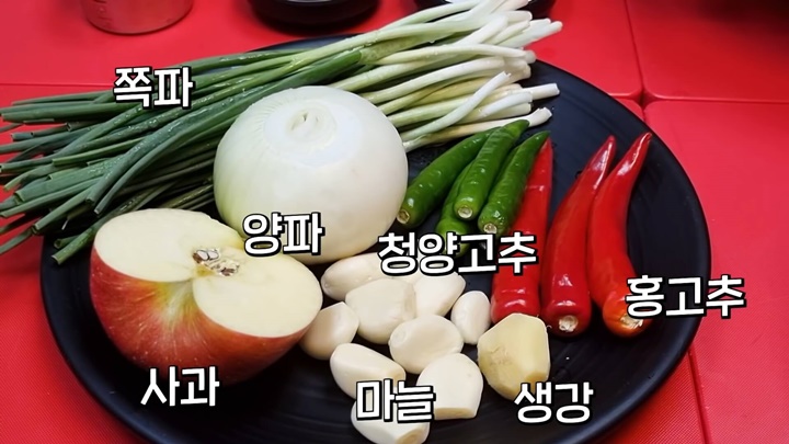 건고추는 15개 55g을 씻어서 준비합니다. 그 외 사과, 마늘, 생강, 홍고추, 청양고추, 양파, 쪽파 등을 준비합니다. 식은 밥 2스푼, 설탕 가득 1스푼, 멸치액젓 1/4컵, 새우젓 2스푼, 천일염 1스푼 반을 준비합니다. 천일염은 열무김치 최종 간을 할 때 사용합니다.