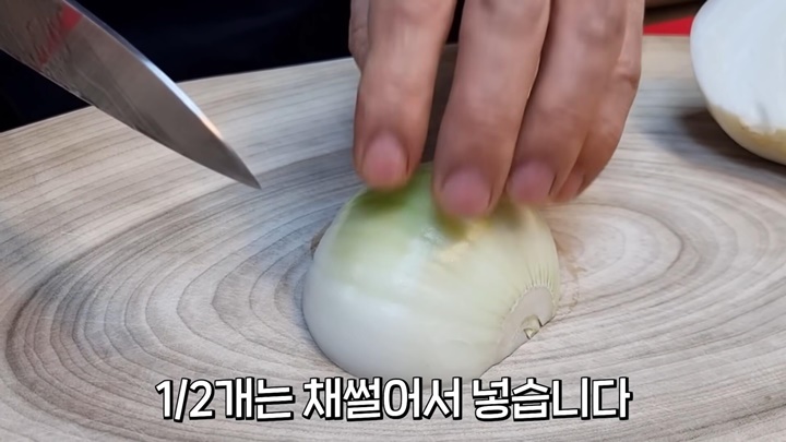 열무의 물기를 빼는 동안 양념을 만들어요. 양파 1개를 반으로 잘라 반 개는 채 썰어서 열무김치에 넣고, 나머지 반 개는 믹서기에 갈기 좋도록 적당하게 잘라주세요.