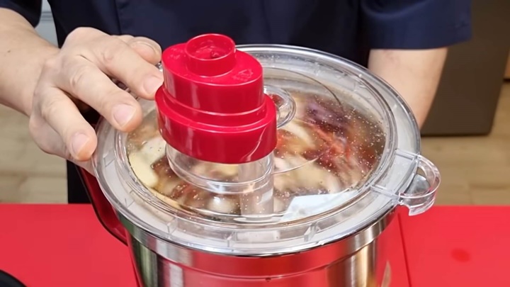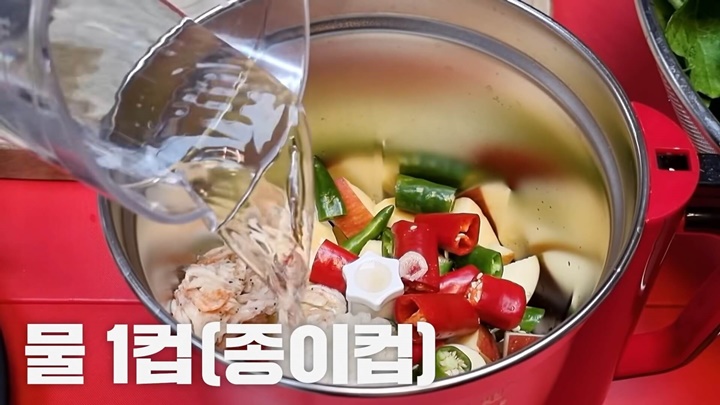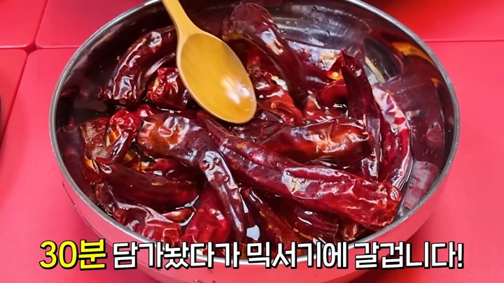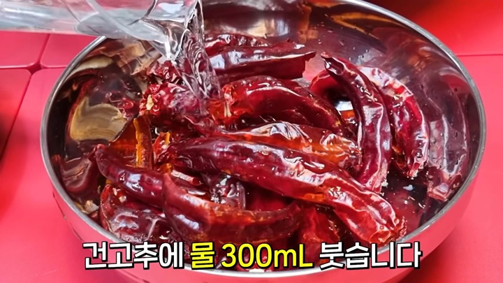 건고추는 깨끗이 씻은 뒤에 물 300ml를 부어서 30분 정도 담가서 불려줍니다. 이렇게 불려두었다가 믹서기에 갈아서 사용하는데, 미리 물에 불려서 갈면 물고추가 된답니다. 물을 부은 뒤에 건고추를 가위로 잘라주세요. 그래야 믹서기에 갈기가 편해요.