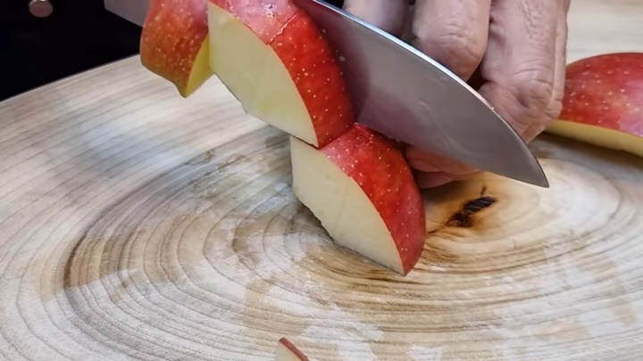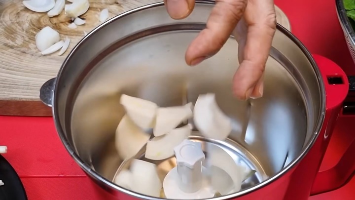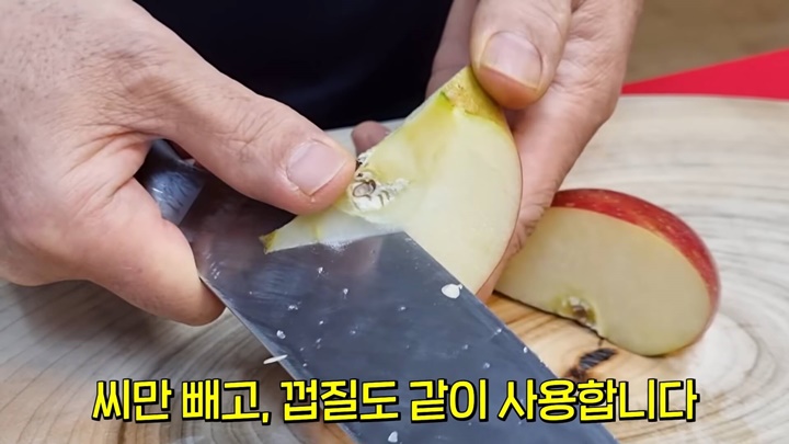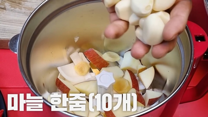 사과는 씨만 빼고 껍질은 벗기지 않아요. 적당한 크기로 잘라 믹서기에 넣어주세요. 생강 1톨도 잘라서 믹서기에 담고, 마늘 한 줌도 넣어주세요.