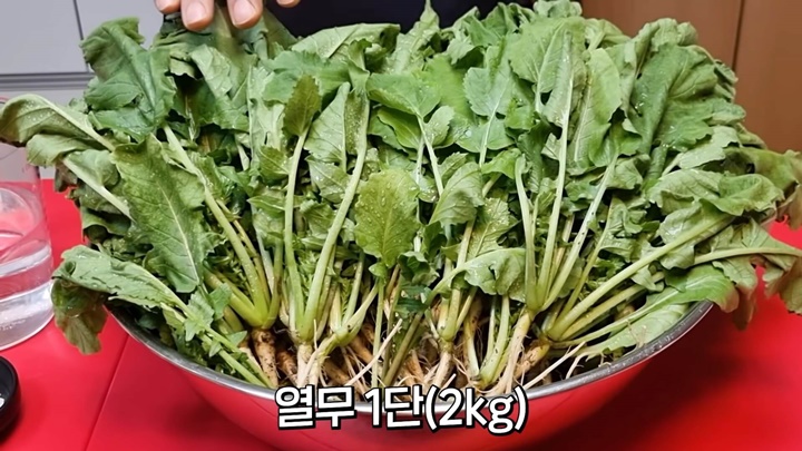 열무는 2kg 정도 1단 준비하는데, 어리고 순한 열무예요. 연하고 잘잘한 열무가 열무김치를 담아놓으면 아주 맛있어요.