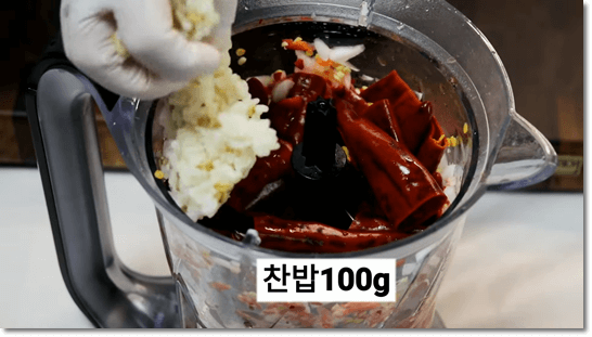 믹서기에 양파, 홍고추, 불린 건고추를 모두 넣고, 찬밥 100g도 같이 넣어줍니다. 열무김치에는 액젓보다는 새우젓을 넣으면 시원하고 깔끔한 맛이 납니다. 새우젓 1컵도 같이 넣어주고, 채수 1컵도 같이 넣어서 갈아줍니다.