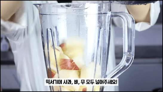 이제 양념물을 만들 차례입니다. 무의 초록부분을 준비해서 믹서에 갈기 좋게 적당한 크기로 썰어줍니다. 무는 초록부분을 사용하면 시원함이 더 좋습니다. 배 1개도 껍질을 벗긴 후 적당한 크기로 썰고, 사과 1개는 껍질째 사용합니다.