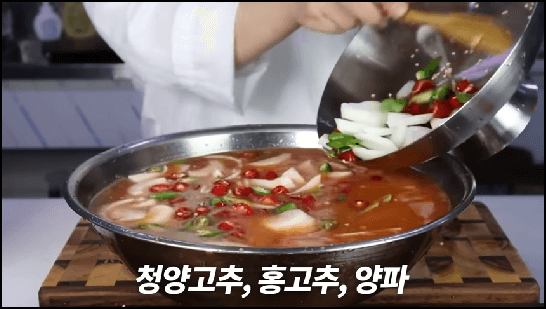 밀가루 풀을 넣고 잘 섞어준 후 천일염 반컵을 넣어 간을 맞춰줍니다. 소금 양은 입맛에 맞춰 가감하시면 됩니다 소금이 다 녹았으면 고추, 양파, 쪽파를 모두 넣어주면 양념물 완성입니다.