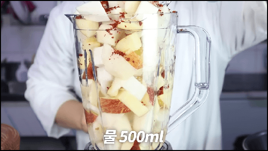 믹서기에 무, 배, 사과를 모두 넣고, 새우젓 2큰술 건더기만 넣어줍니다. 굵은 고춧가루 4큰술, 물 500ml를 넣고 갈아줍니다. 1차로 갈아서 부피가 줄어들면 마늘 10톨을 넣고 갈아줍니다. 만약 열무 물김치를 하얗게 하실거라면 고춧가루만 생략하면 됩니다.