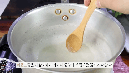 밀가루 풀을 쑬 때는 밀가루 5큰술과 물 500ml를 준비합니다. 먼저 냄비에 물 250ml만 넣고 끓여주고, 남은 물에 밀가루를 넣어 잘 풀어줍니다. 물이 끓기 시작하면 밀가루 푼 것을 넣고 잘 저어가며 끓여줍니다. 풀은 가장자리가 아닌 중앙에서 보글보글 끓기 시작할 때 불을 끄면 되고, 차갑게 식혀줍니다.
