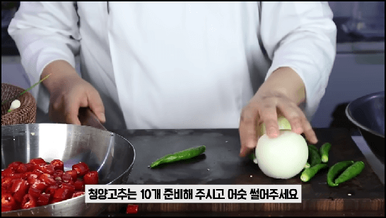 열무 물김치에 같이 넣어줄 고추와 양파, 쪽파를 잘라줍니다. 홍고추 15개는 일자로 뚝뚝 썰어주는데 고추씨도 들어가야 맛있기 때문에 그대로 다 사용합니다. 청양고추는 어슷썰어 주는데, 혹시 매운 것을 못드시는 분들은 고추 양을 줄이셔도 됩니다. 양파는 굵게 채 썰어주고, 쪽파는 먹기 좋은 크기로 썰어주면 됩니다.