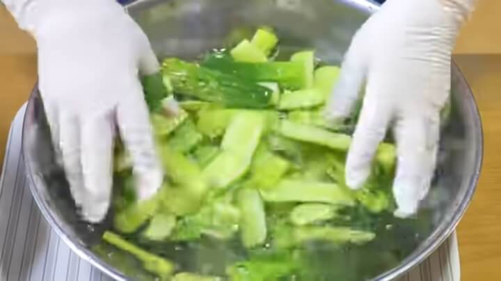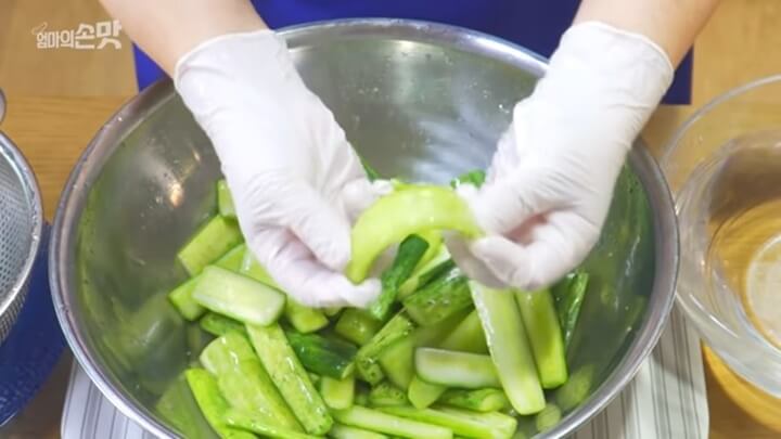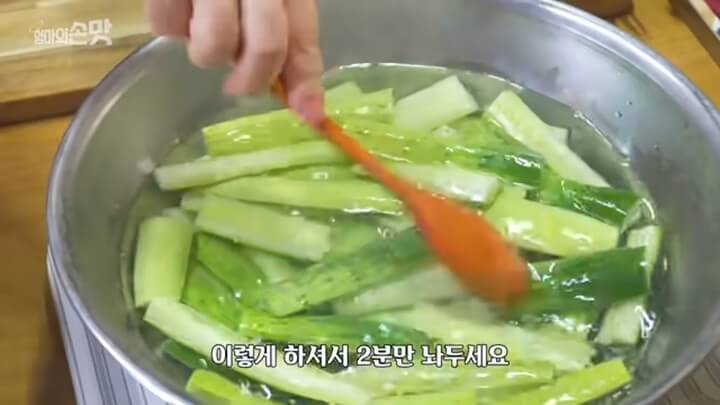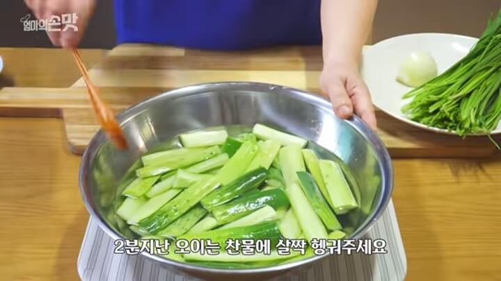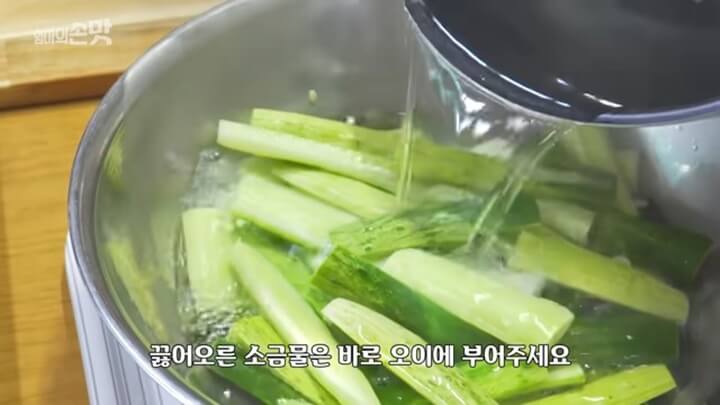 뜨거운 소금물을 부은 다음 2분만 그대로 놔둡니다. 2분이 지난 뒤에 오이를 찬물에 살짝 헹궈줍니다.
