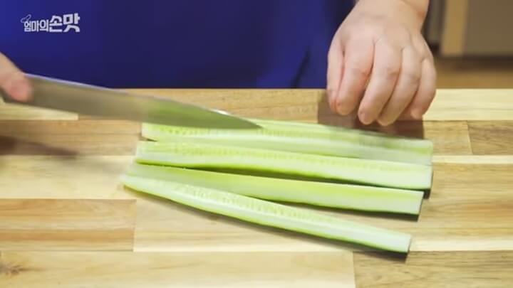 씨를 제거한 오이는 먹기 좋은 크기로 3~4등분으로 잘라줍니다.