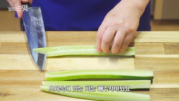 오이는 뜨거운 물에 한번 튀겨서 만들면 무르지 않고 아삭하게 만들 수 있는데 오이 씨는 뜨거운 물에 들어가도 물컹거리니 꼭 제거해주세요.