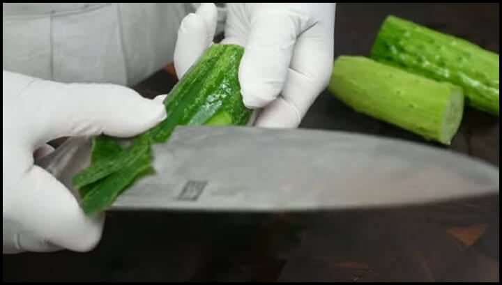 2) 푸른 오이 꼭지 쪽은 껍질이 두꺼워서 맛이 없을 수 있으니 껍질을 살짝씩만 벗겨내 줍니다. 그러면 식감이 지리지 않고, 양념도 더 잘 배어서 맛있습니다.