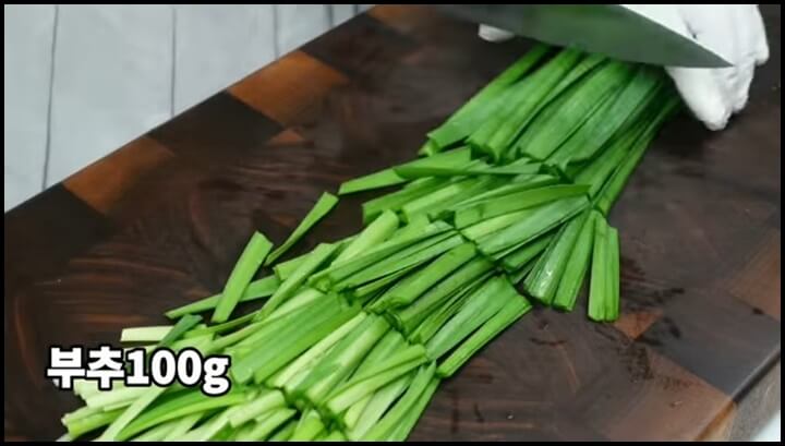 1) 부추 100g을 오이 길이와 비슷하게 썰어줍니다.