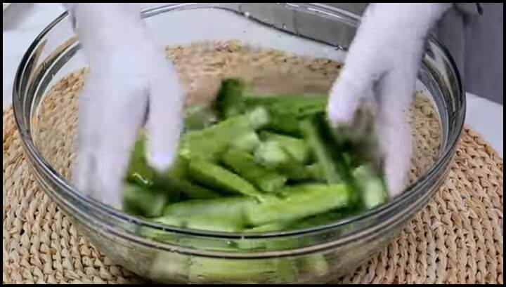 3) 중간에 오이를 위아래로 한번 뒤집어 주어 골고루 절여지도록 해 줍니다.