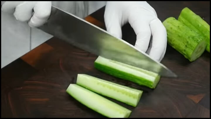 1) 오이 5개는 양 끝을 잘라준 후 삼등분으로 잘라서 다시 4쪽으로 잘라줍니다.