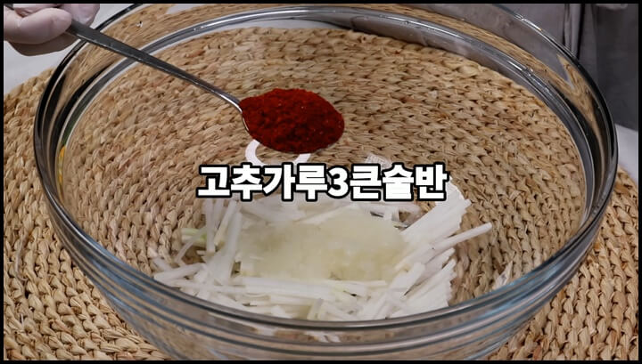 2) 간 양파 듬뿍 2큰술과 고춧가루 3큰술을 넣어서 무쳐줍니다. 고춧가루 색을 무에 대강 입혀줍니다.