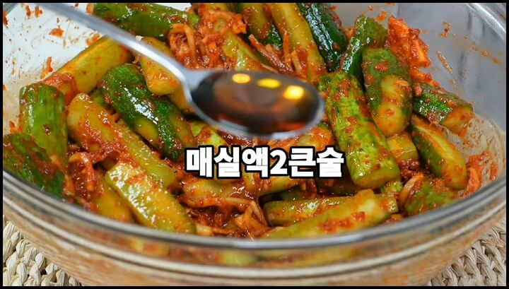 6) 오이가 빨갛게 무쳐졌으면 점성과 단맛을 내 줄 조청 2큰술을 넣고