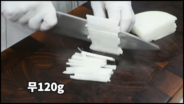 3) 무 120g은 채 썰어 줍니다. 무는 오이와 함께 무쳐주면 다 먹을 때까지 아삭함이 배가 됩니다.