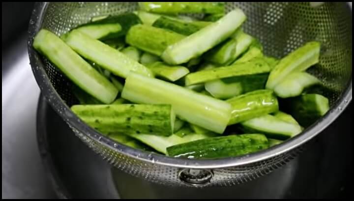 1) 40분간 절인 오이는 체에 밭쳐서 절임물을 완전히 걸러냅니다.